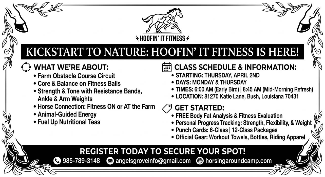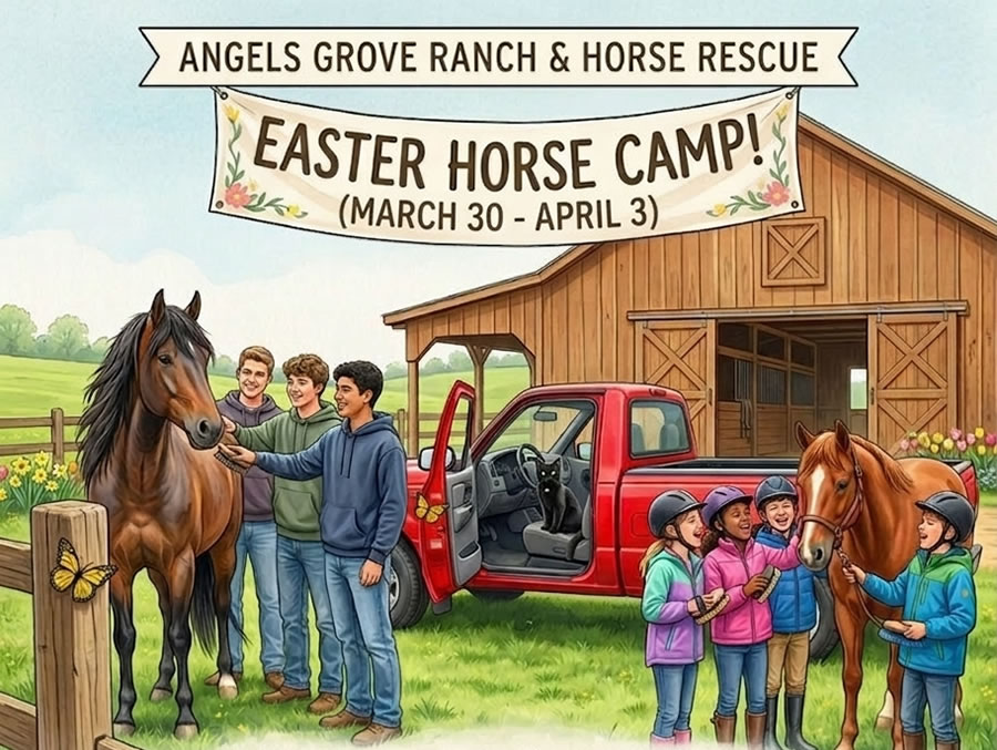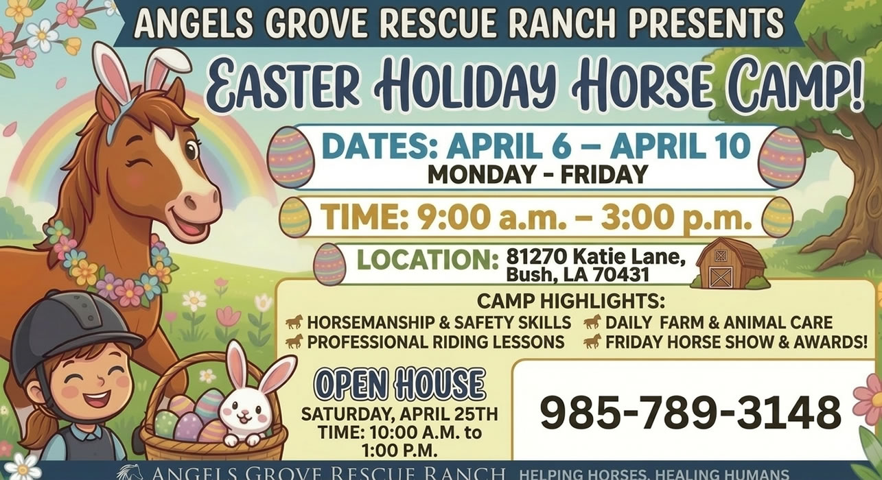 April 25th, 2026 from 10:00 am until 1:00 pmAngels Grove Ranch81270 Katie Lane, Bush, La 70431 Meet the herd Pick your horse Receive safety materials Giveaways & Activities FREE T-SHIRTS: To everyone who signs up for camp! DOOR PRIZES: Including free Horse Lessons! FUN & GAMES: Exciting activities for all the kids. MEET THE ANIMALS:…