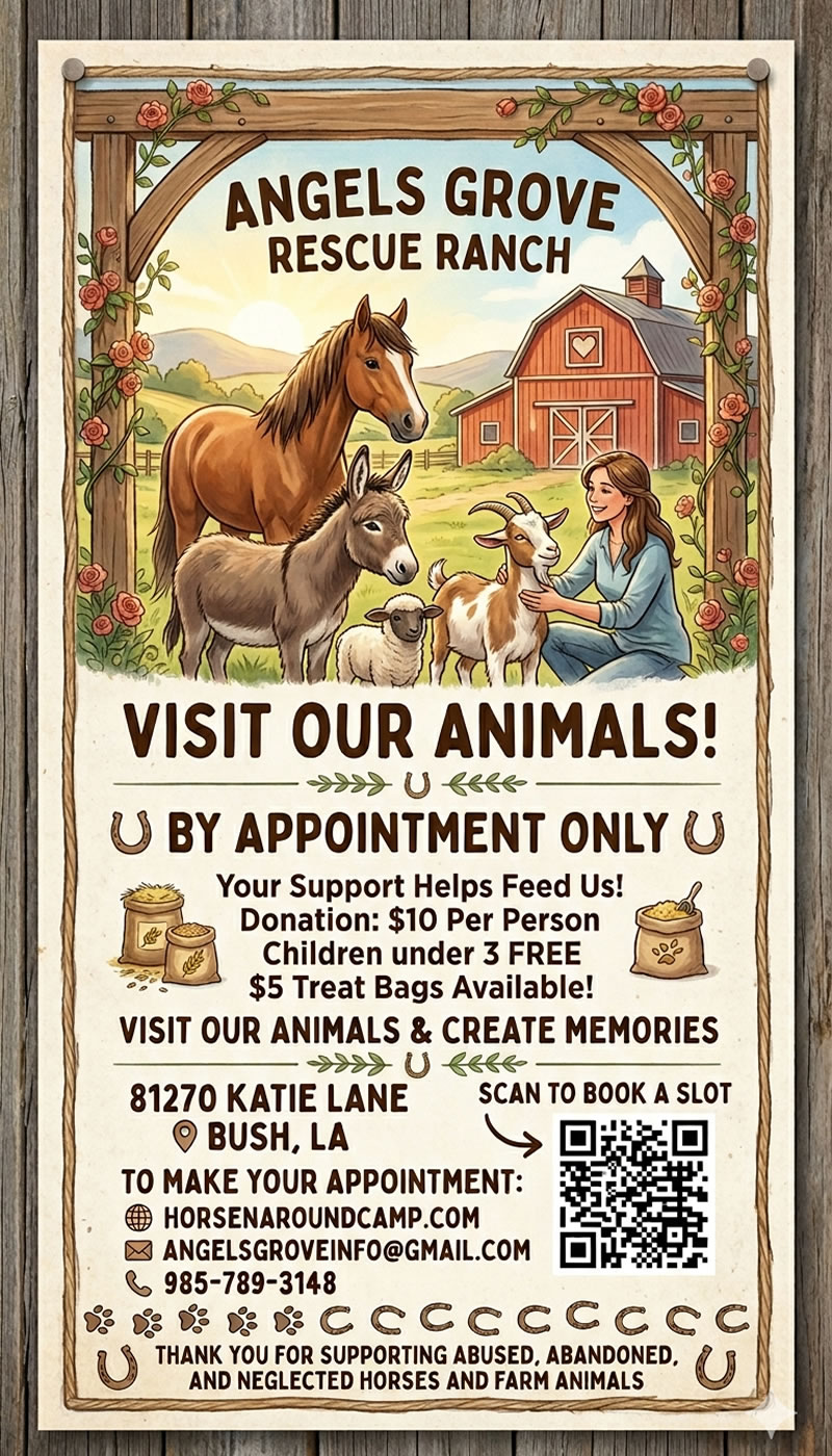 First, we want to say thank you for your love and interest in the animals here at the ranch! We truly enjoy seeing the joy these rescues bring to everyone who visits. As we continue to grow, our primary mission remains the same: providing the best possible care, nutrition, and medical support for our horses and farm animals. To make sure we can keep our hay lofts full and our rescues healthy, we are transitioning to a scheduled-visit model. Starting immediately, we kindly ask that all visitors make an appointment before coming out to the ranch. This helps us ensure that our staff is available to give you a safe experience and that the animals aren’t overwhelmed by too many “surprises” throughout the day.